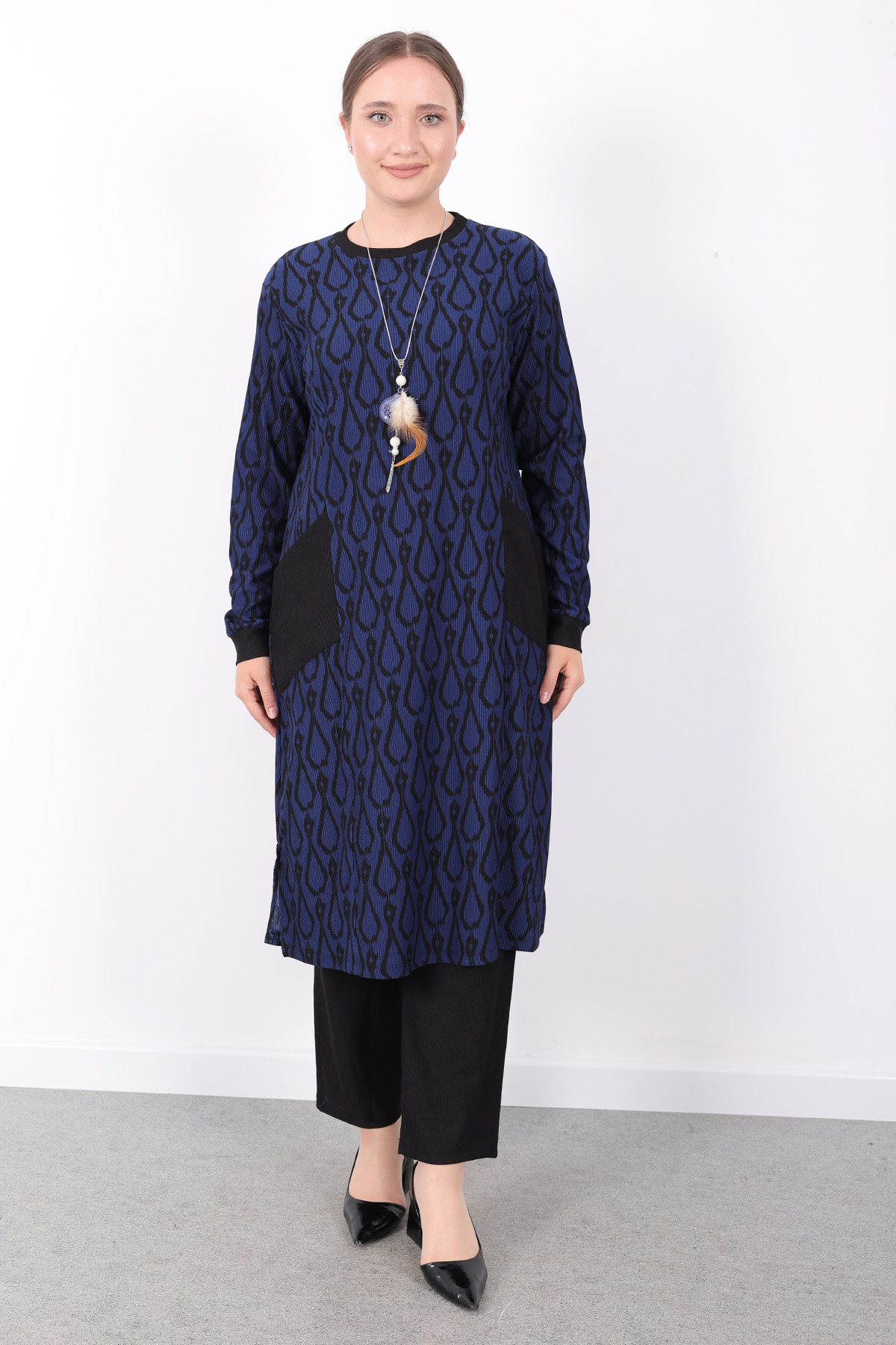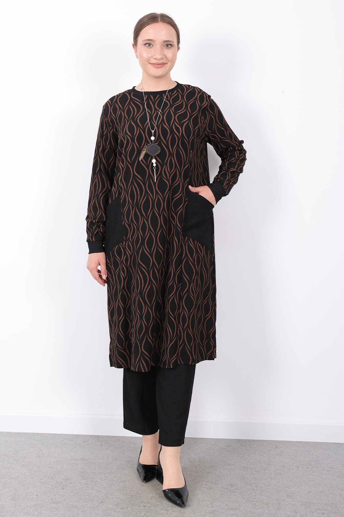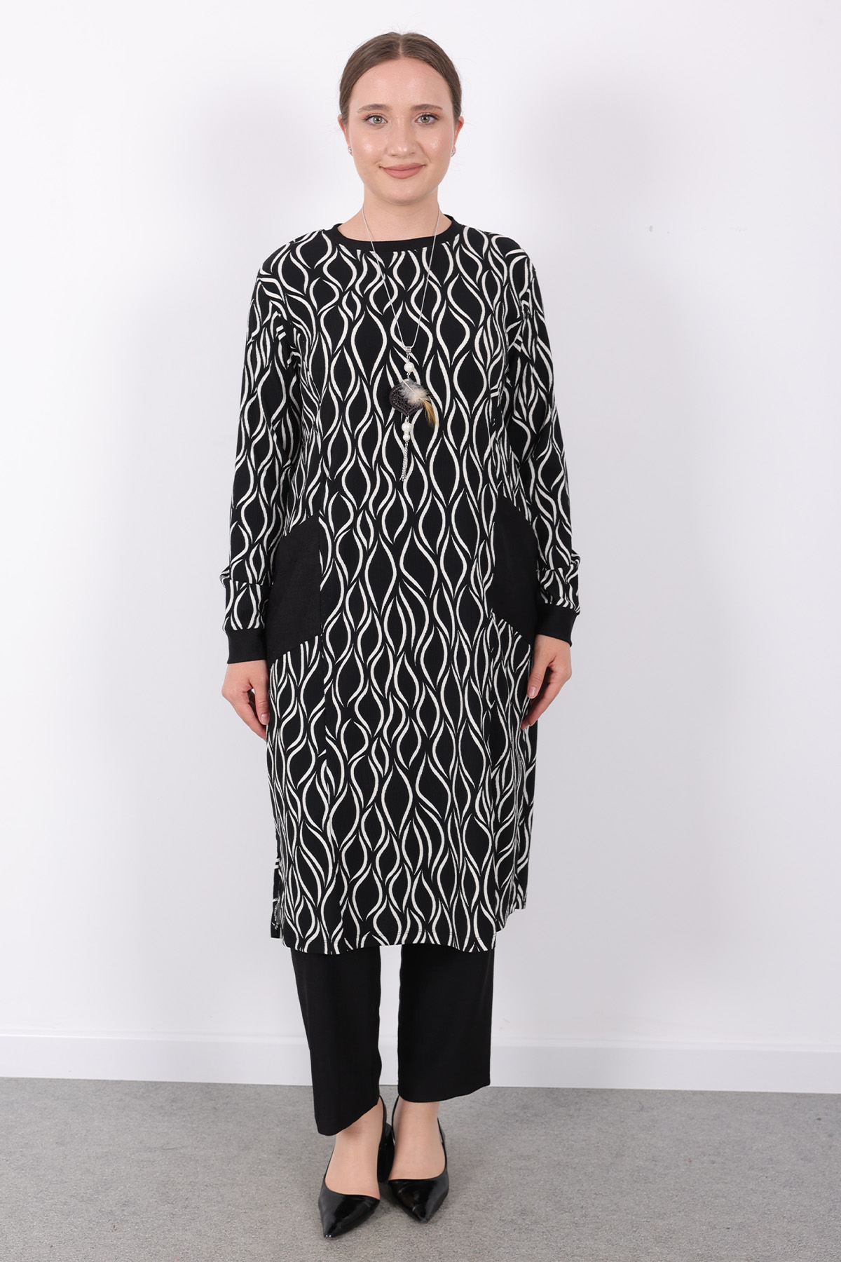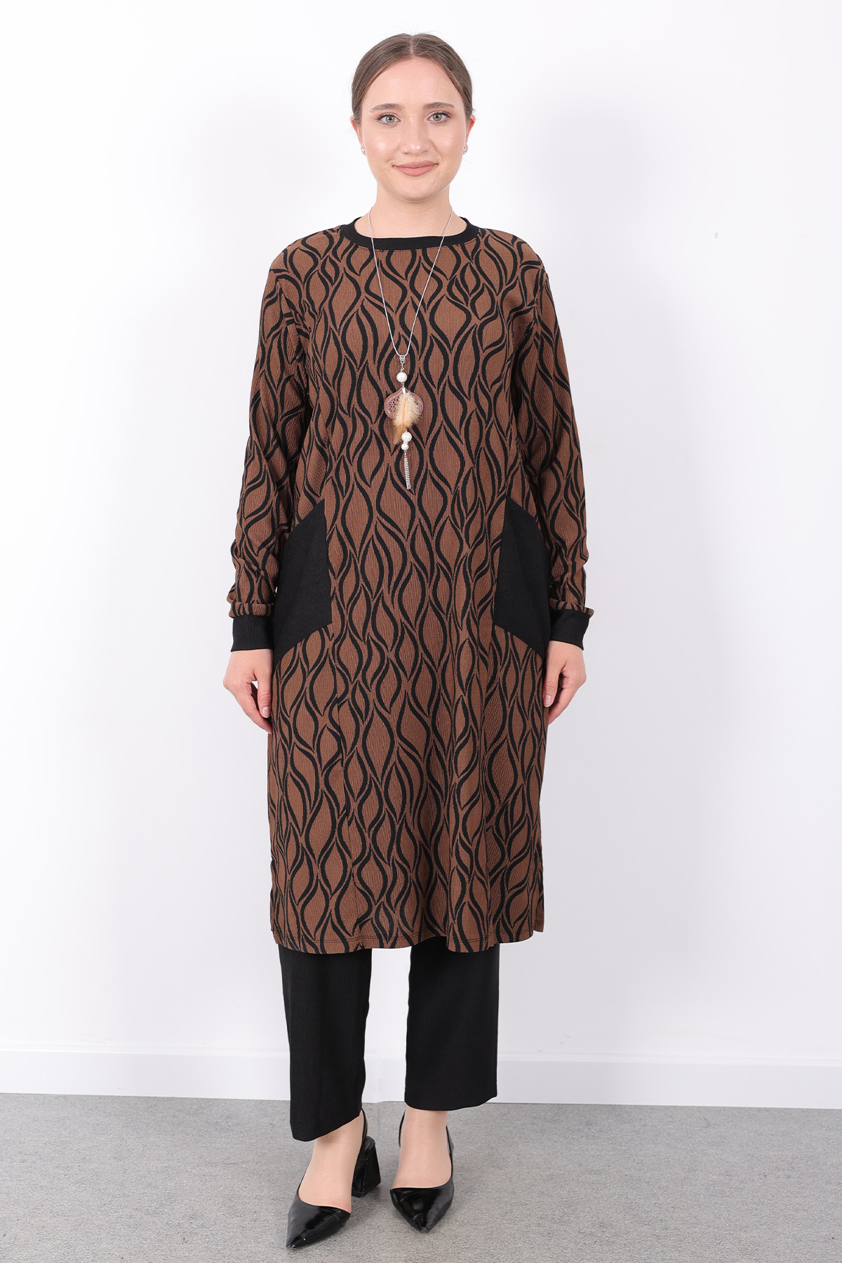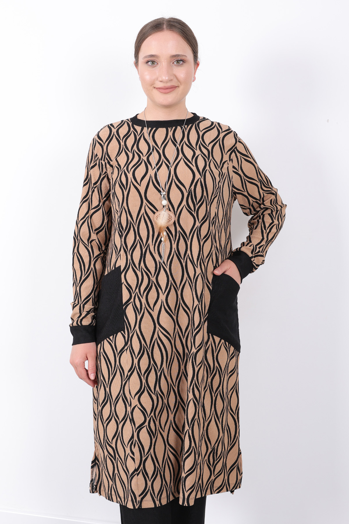 Rahat Mevsimlik Günlük Bürümcük Kumaş Desenli Cepli Kolyeli Spor Tunik