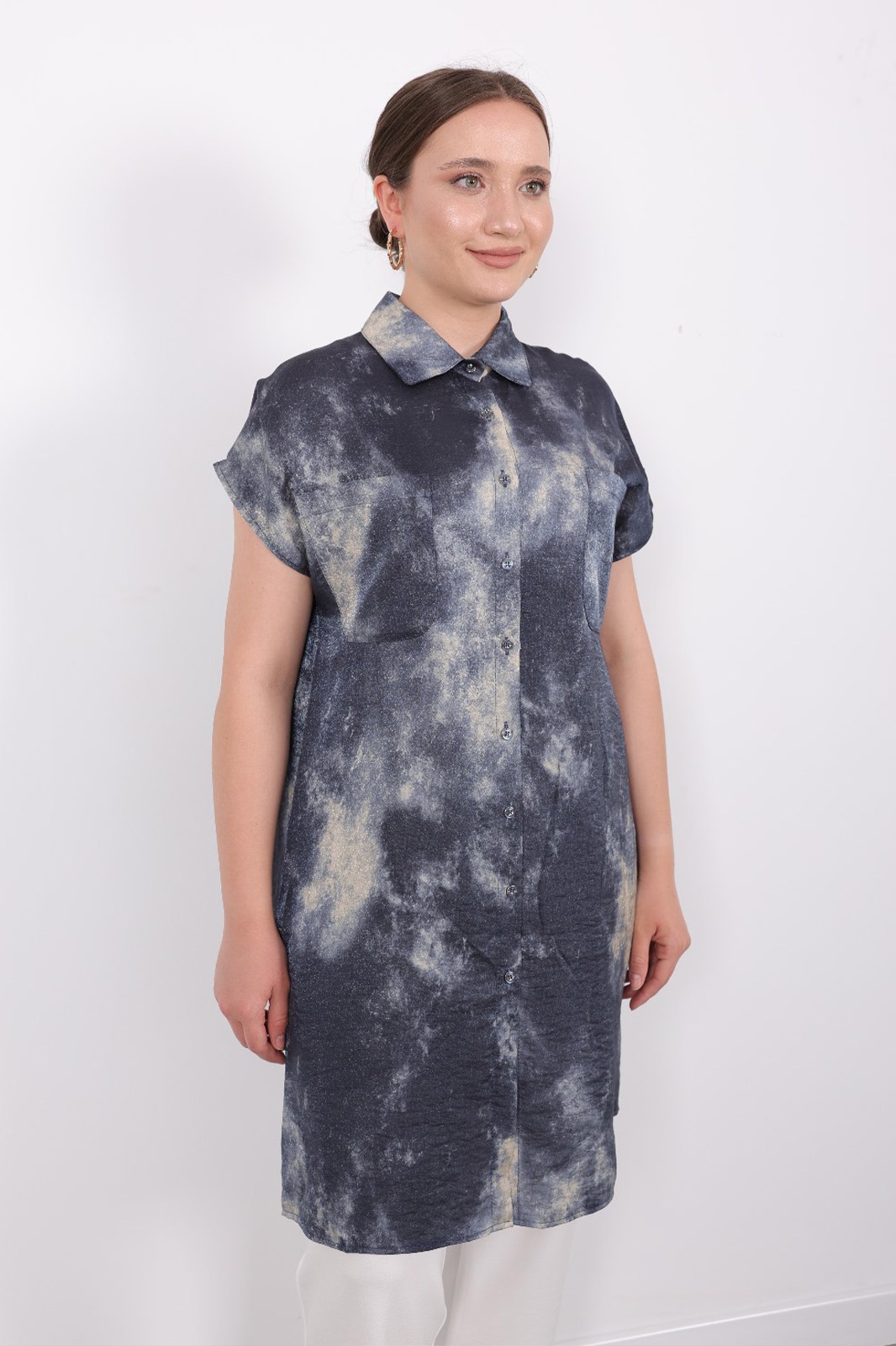 Yazlık Şık Cepli Kolsuz Düğmeli Parlak Kumaş Gömlek Elbise Tunik Yelek